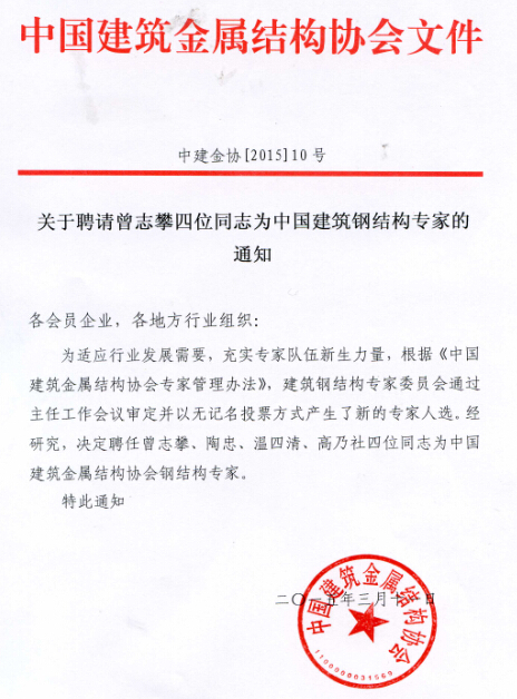 关于聘请曾志攀四位同志为中国建筑钢结构专家的通知