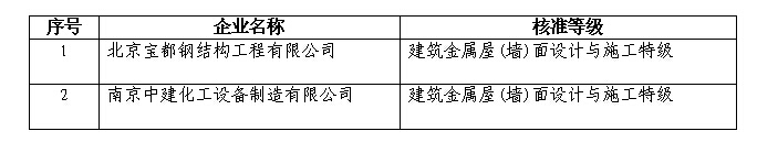 根据《建筑金属屋(墙)面设计与施工资质等级标准》和《建筑金属屋(墙)面设计与施工资质管理办法》的规定,经审核,2家企业申请的资质等级符合相应等级要求,准予发证。