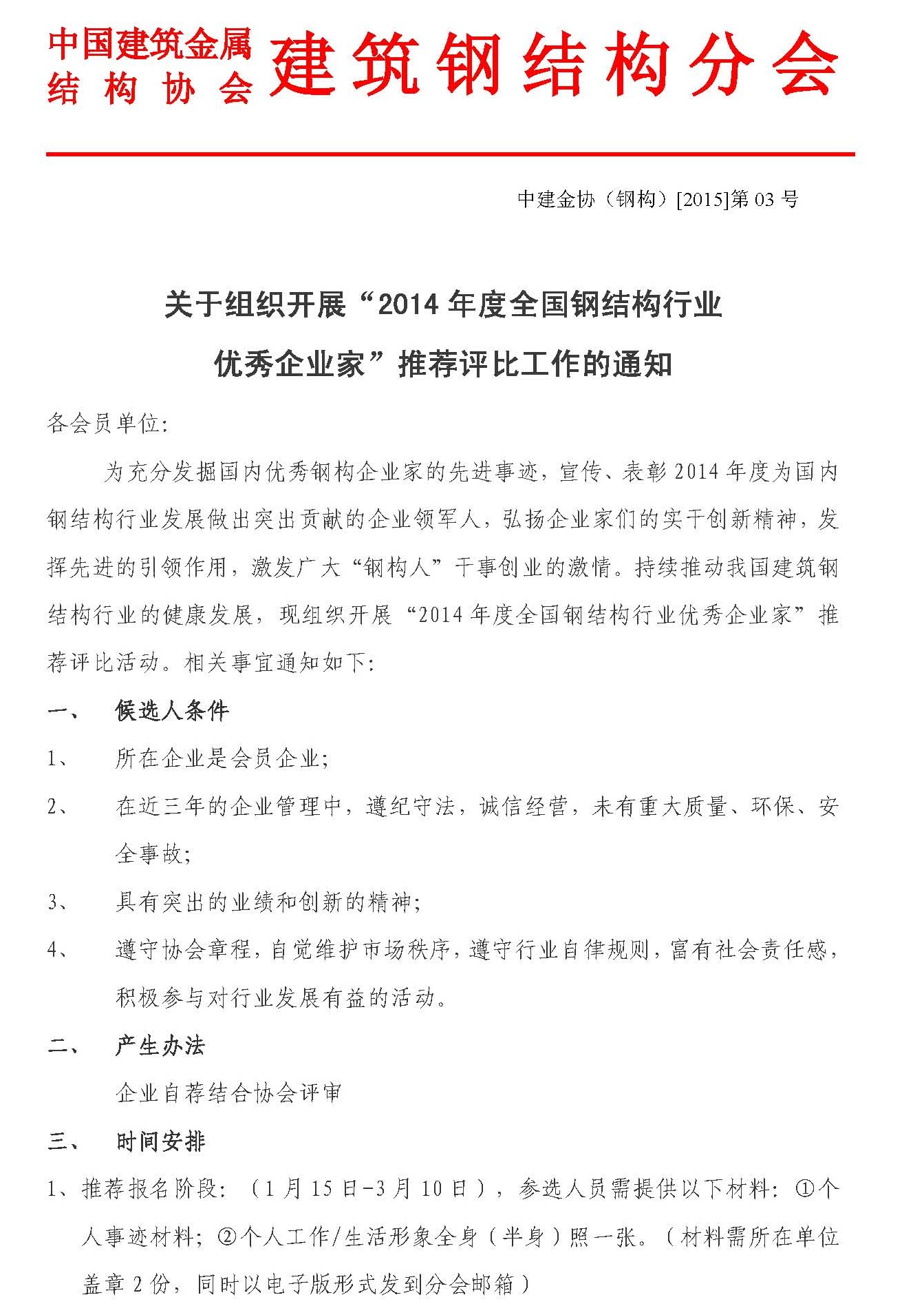 关于组织开展“2014年度全国钢结构行业优秀企业家”推荐评比工作的通知