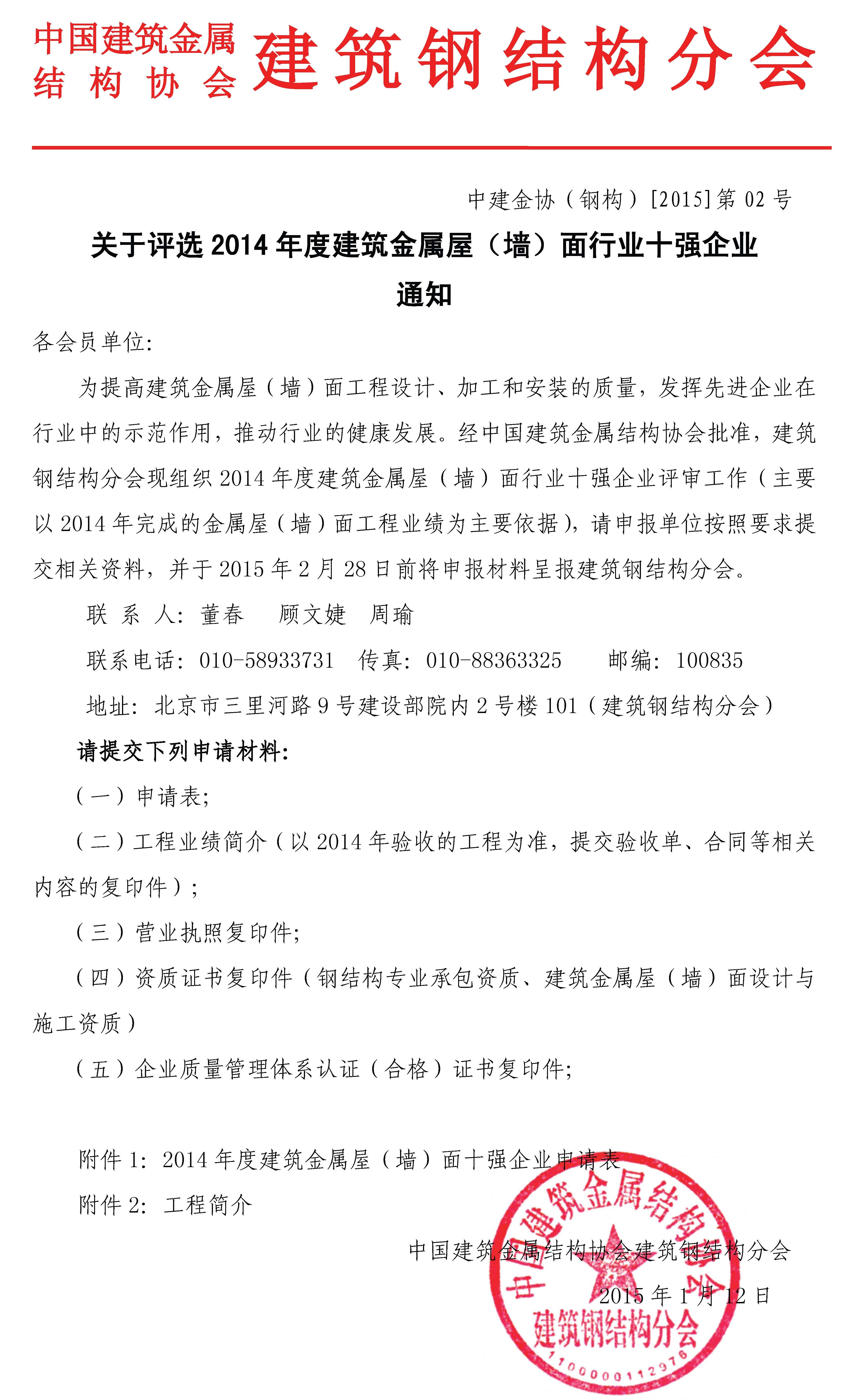 关于评选2014年度建筑金属屋(墙)面行业十强企业通知