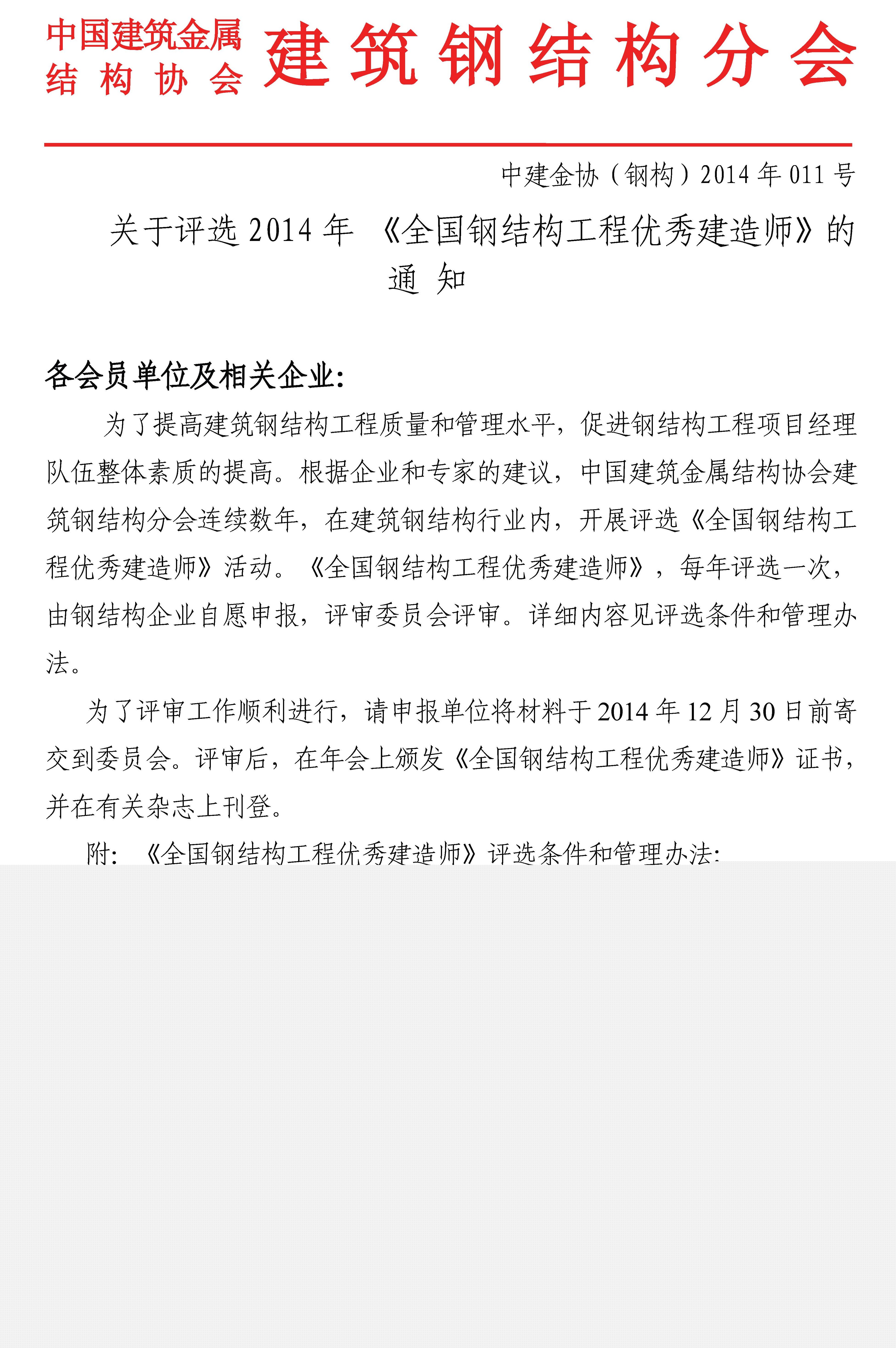 关于评选2014年 《全国钢结构工程优秀建造师》的 通知
