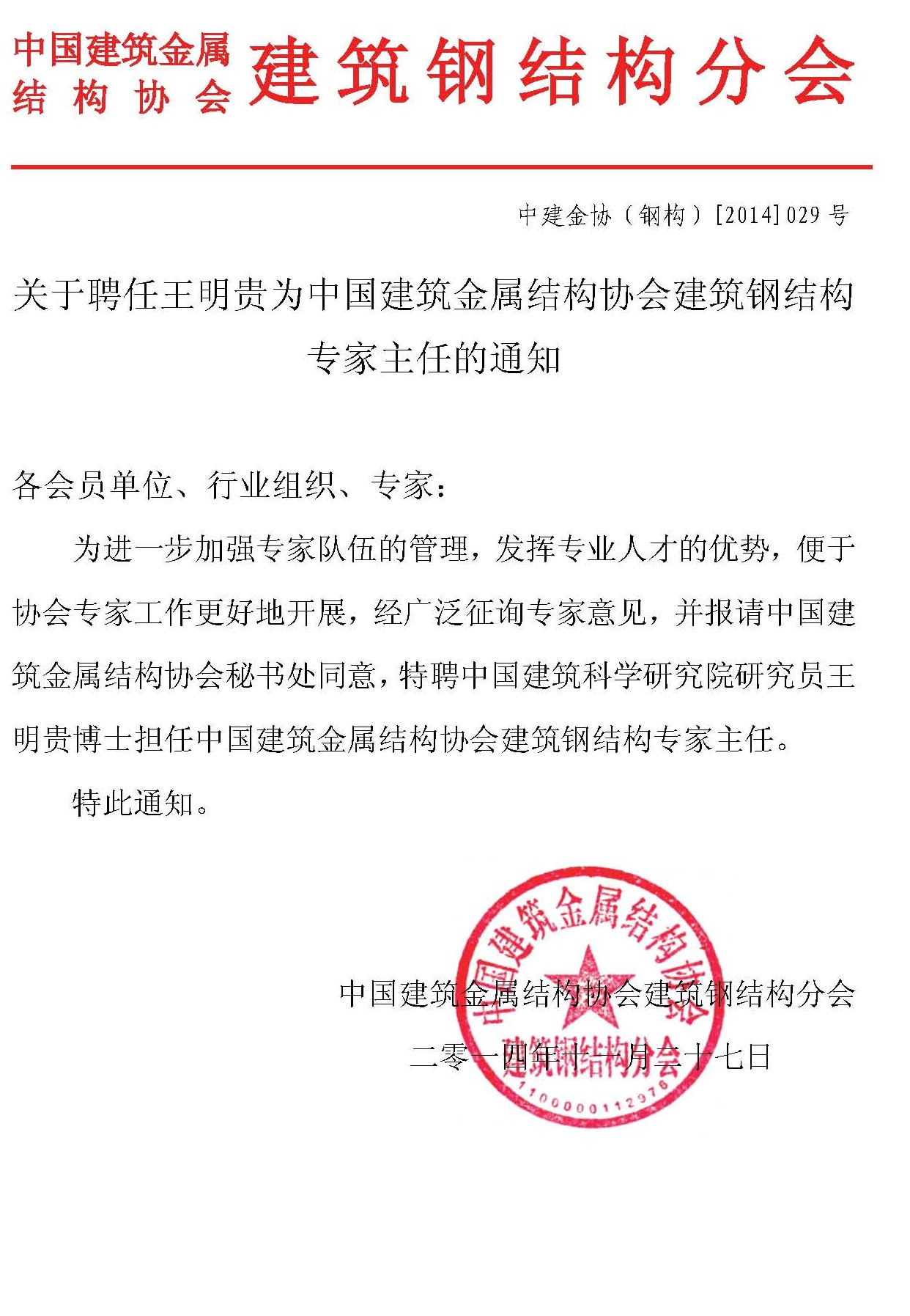 关于聘任王明贵为中国建筑金属结构协会建筑钢结构专家主任的通知