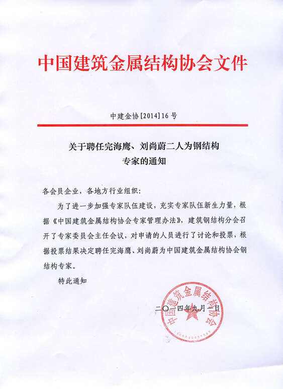 关于聘任完海鹰、刘尚蔚二人为钢结构专家的通知