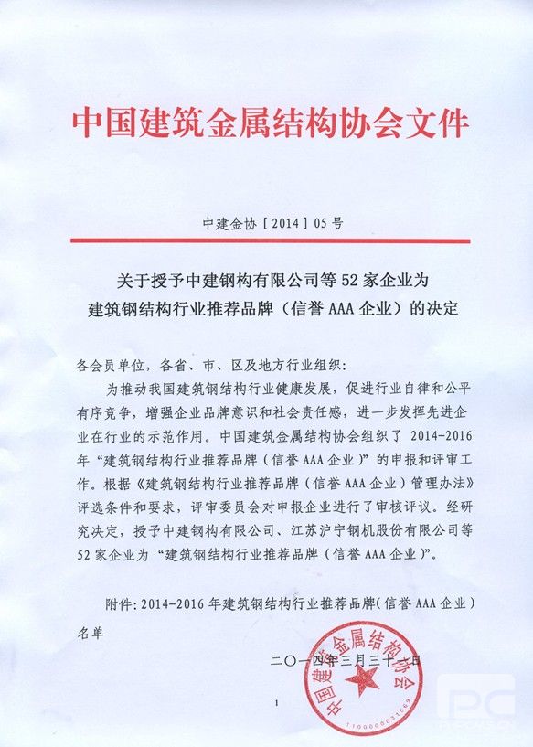 2014-2016年度建筑钢结构行业推荐品牌(信誉AAA)企业名单公布