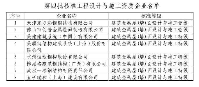 根据《建筑金属屋(墙)面设计与施工资质等级标准》和《建筑金属屋(墙)面设计与施工资质管理办法》的规定,经审核,8家企业申请的资质等级符合相应等级要求,准予发证。